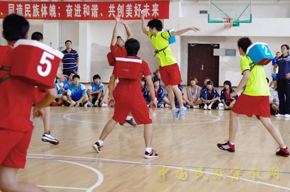 原来的狩猎比赛,每队有布制的野兽“虎”和“熊”各一个。猎物可用玩具猎物,也可用沙袋。沙袋有用布做的,有用皮革做的,拳头大小,重量不超过200克。比赛开始后,队员互相往对方背篓内投掷“野兽”,投进“虎”得2分,投进“熊”得1分。比赛共进行5局,每局5分钟,五战三胜制。